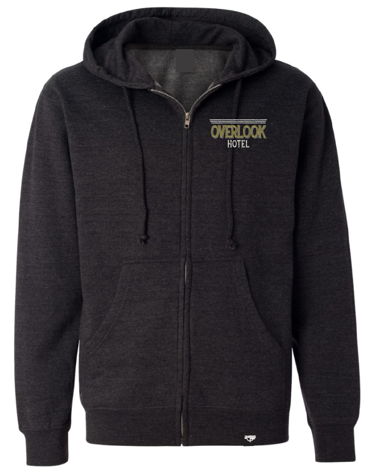 Stay warm and spooky with our Glow in the Dark Overlook Hotel sweatshirt. This zip-up features a small graphic on the front and a large glow in the dark graphic on the back. Perfect for any fan of the classic horror film. (No creepy twins included!)